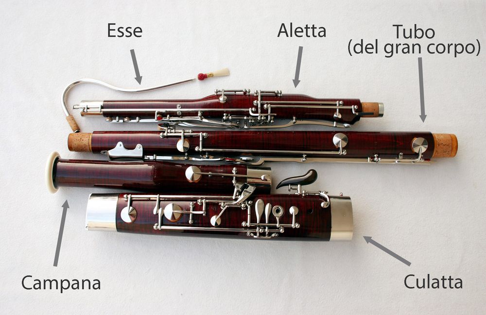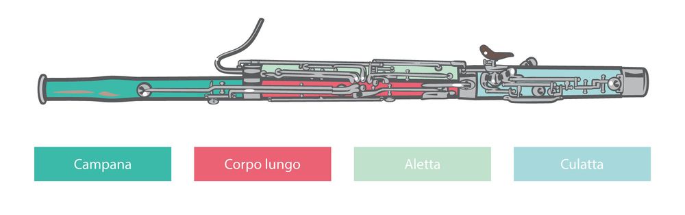 A partire da qui, con "destra" e "sinistra" ci riferiremo per tutta la guida agli innesti visti dal retro del fagotto, cioè dal lato rivolto verso il fagottista.