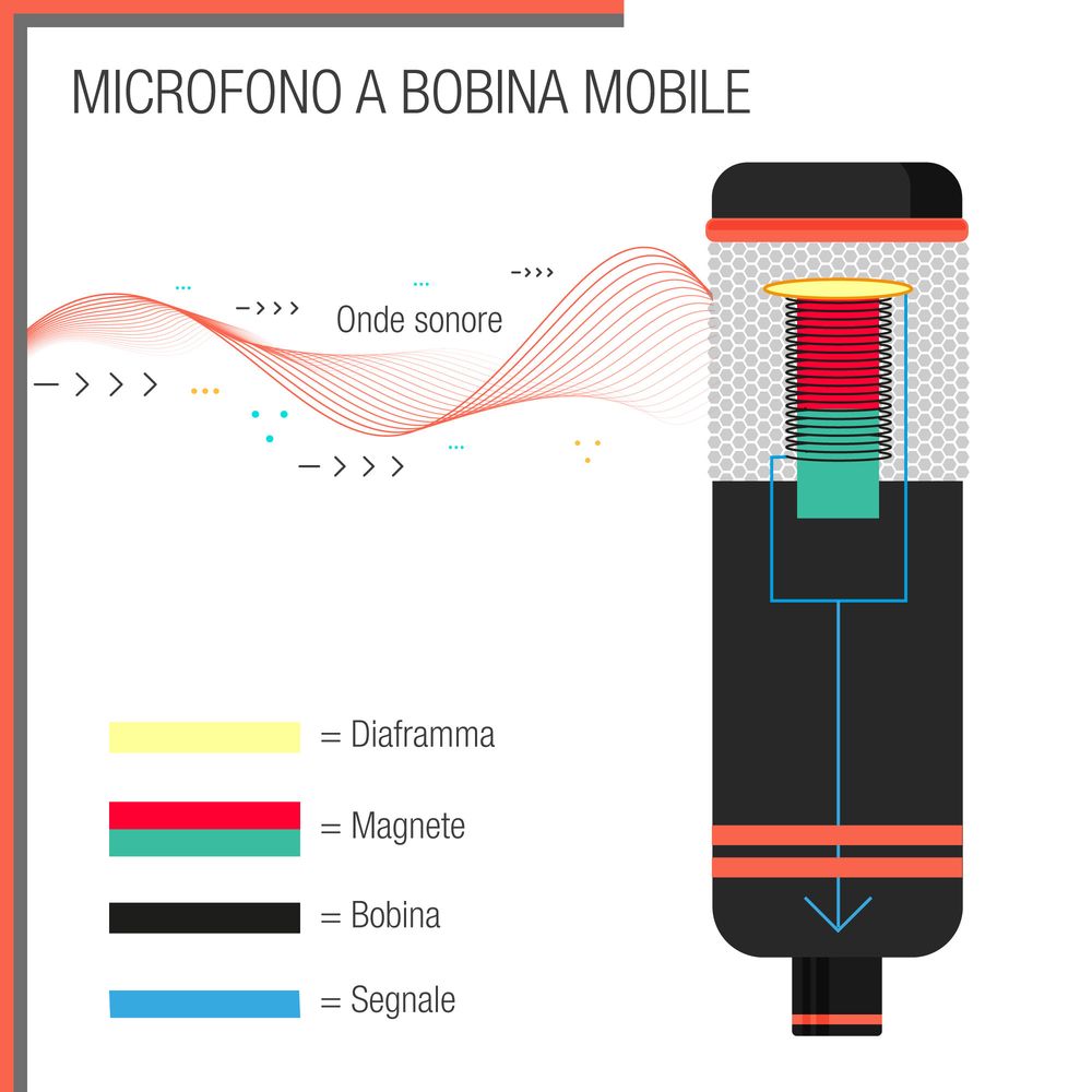 Il microfono dinamico per voce comporta una bobina mobile ed è costruito in modo simile a un altoparlante: la bobina è fissata sul retro di un diaframma che a sua volta si trova in un campo magnetico. Quando un suono raggiunge il diaframma, questo si muove insieme alla bobina al ritmo delle vibrazioni sonore e, grazie al suo movimento nel campo magnetico, viene generata nella bobina una piccola corrente (induzione) che produce un segnale di uscita. Amplificando questa minima tensione alternata e inviandola a un diffusore il processo si inverte nuovamente: l'altoparlante del diffusore riproduce il suono raggiunto dalla membrana del microfono, ma in modo più forte.