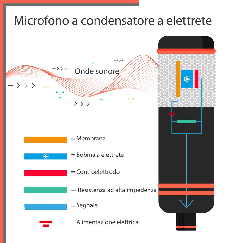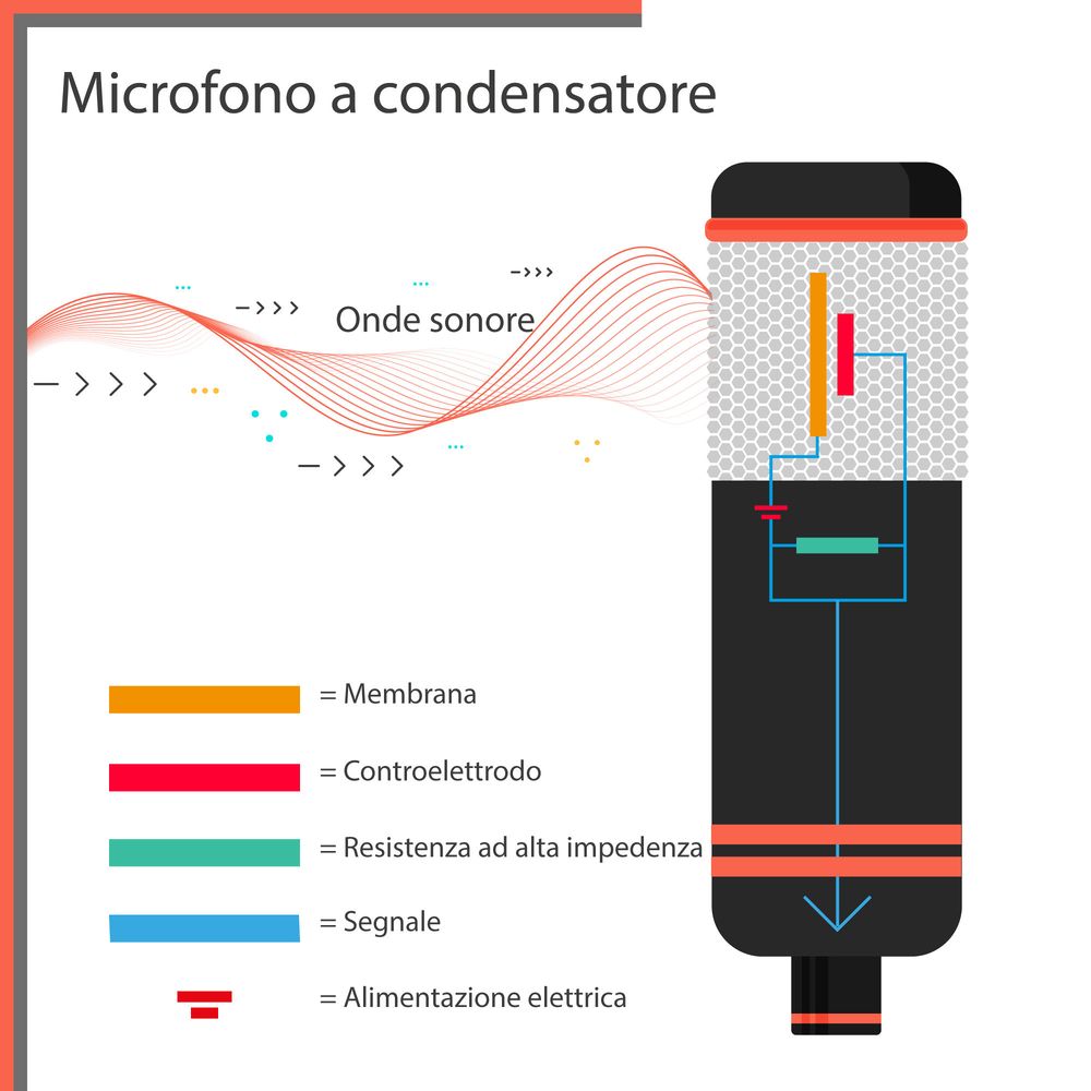 I microfoni a condensatore sono contemporanei dei dinamici, solo dalla metà degli anni '80 furono però utilizzati su larga scala anche sul palco per amplificare la voce. Essi sono infatti più complessi e quindi, in linea di principio, anche più delicati rispetto ai modelli a bobina mobile. Nei primi, il suono colpisce un diaframma rivestito in oro posizionato a una distanza minima da una piastra rigida in metallo, il controelettrodo, che forma un condensatore insieme al diaframma. Quando le onde sonore colpiscono quest’ultimo, la distanza tra il diaframma vibrante e il controelettrodo rigido cambia, modificando la capacità del condensatore al ritmo delle onde sonore. I modelli a condensatore necessitano di un'elettronica aggiuntiva per tradurre questa variazione di capacità in tensione e amplificare la minuscola tensione alternata fino a un livello utilizzabile. Si tratta dell’alimentazione phantom, ossia di 48 V forniti dal mixer o dall’apposito preamplificatore, trasmessa al microfono tramite un normale cavo XLR. Una soluzione molto pratica di cui dispongono ormai quasi tutti i mixer e i preamplificatori microfonici in ragione della grande diffusione dei microfoni a condensatore. Alcuni di questi modelli possono funzionare anche a batterie, ma non tutti.