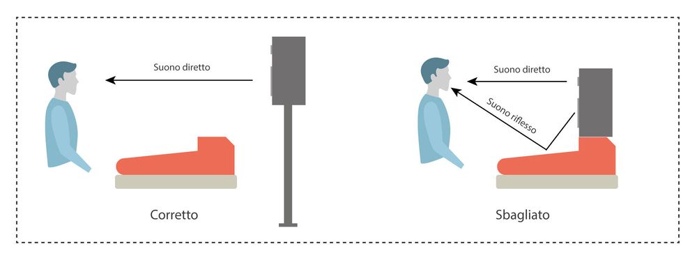Il suono trasmesso direttamente dall'asse centrale del diffusore dovrebbe raggiungere immediatamente l'orecchio del tecnico del suono: è quindi indispensabile posizionarlo su appositi supporti, fissarlo alla parete o al soffitto ed evitare di posizionarlo su un tavolo, uno scaffale o simili.