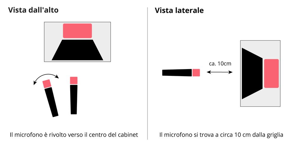 Questo è il punto in cui si può facilmente passare dalle stelle alle stalle, anche pochi centimetri possono fare una grande differenza dal punto di vista sonoro. Per la cosiddetta ripresa diretta, il microfono viene generalmente collocato molto vicino all'altoparlante, quasi a toccare il rivestimento o la griglia frontale della cassa. Il microfono posto esattamente al centro dell'altoparlante apre il dominio a un suono molto ricco di frequenze alte. Spostandolo verso il bordo dell'altoparlante, queste diminuiscono sempre più.